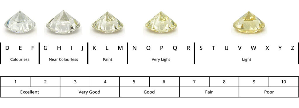 Diamonds colours are graded on a scale that ranges from D (colourless) to Z (a light yellow). The colourless diamonds rated D, E and F are the best grade in their class, and the price tag will reflect this. It must be remembered however that a quality diamond will not simply have a top grade for colour, it must also have good clarity and cut to showcase its brilliance and sparkle.