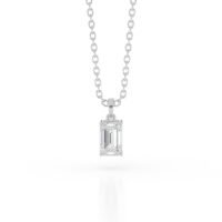 The emerald cut, with its long facets and linear elegance, offers a unique sparkle — a “hall-of-mirrors” effect that reflects light with refined sophistication. The diamond is held securely in a classic four-prong setting, suspended gracefully from a polished white gold chain that complements its brilliance.