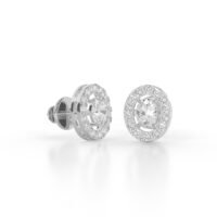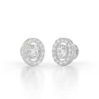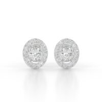 These earrings feature a stunning oval-cut lab-grown diamond at the center of each stud, beautifully framed by a delicate halo of round lab-grown diamonds. The oval shape lends a refined elegance, while the halo setting maximizes sparkle and gives the illusion of a larger central stone. The diamonds are set in polished 9K white gold, which adds to the radiant allure of the design and offers lasting durability and shine.